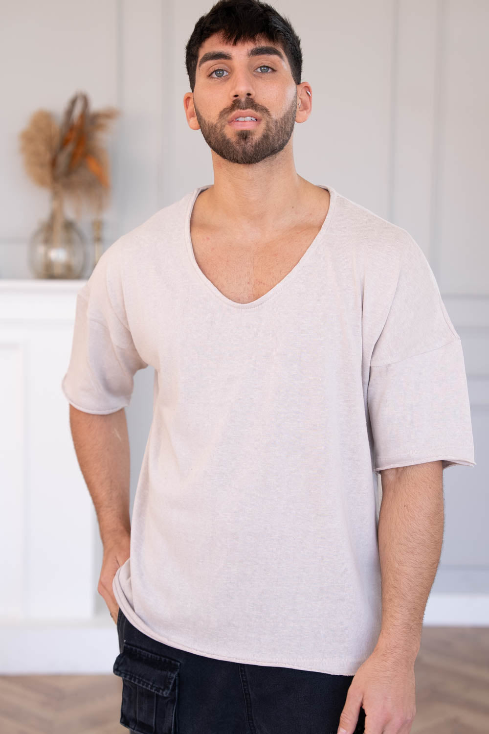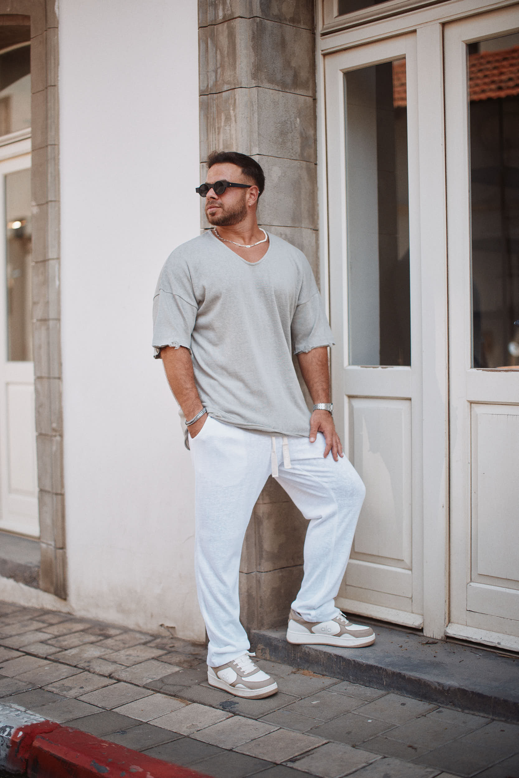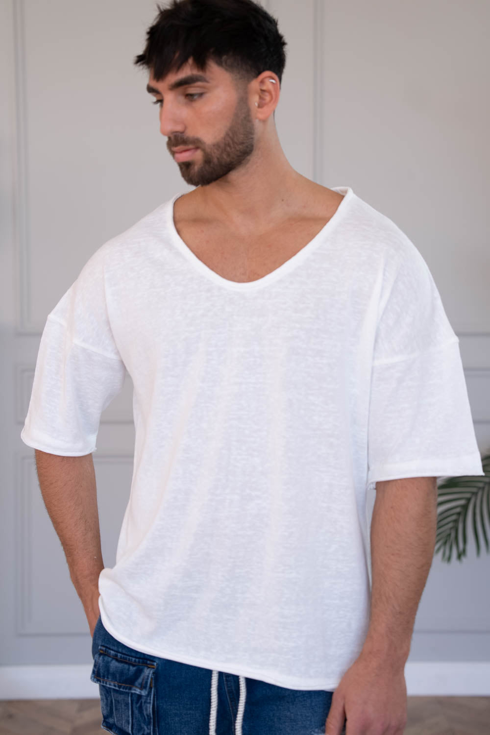 חולצת פשתן לגבר עם שרוול אוברסייז וצווארון פתוח – קלילה ועם נוכחות