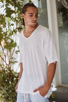 חולצת פשתן לגבר עם שרוול אוברסייז וצווארון פתוח – קלילה ועם נוכחות